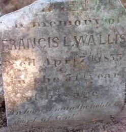 13 August 1850: Francis L. Wallis, farmer, age 46, is enumerated in the First Election District of Kent County MD. Also in the household are Emily, age 46, William age 19, Ludolph age 15 and Bodien, age 6. His real estate is valued at $15,000.